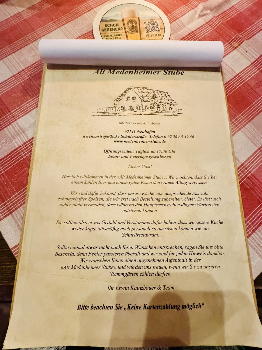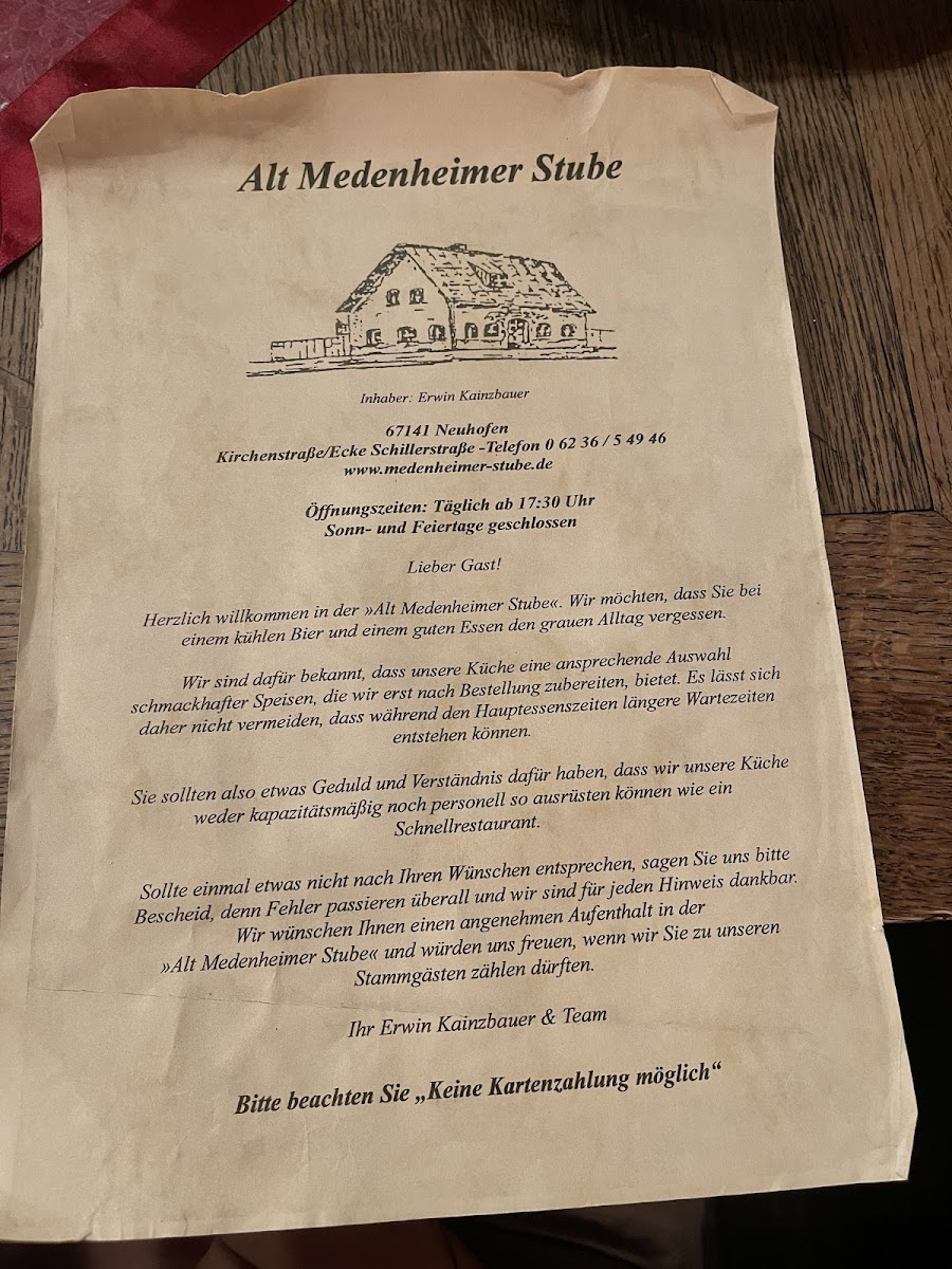 At Alt Medenheimer-Stube, located in the charming town of Neuhofen, you’ll find a menu that brings the heart of German cuisine to life. Nestled on Schillerstraße, the restaurant offers a warm and inviting atmosphere, perfect for those looking to indulge in classic dishes with a contemporary twist. The menu features a selection of hearty, home-cooked meals, from savory schnitzels to rich, flavorful stews, each prepared with fresh, local ingredients. Whether you're craving a traditional German beer paired with your meal or a comforting dessert to finish, there’s something for everyone. The food at Alt Medenheimer-Stube is crafted to evoke the authentic flavors of Germany, served in a relaxed, friendly setting where every dish tells a story. So, whether you’re a local or a traveler passing through, the menu promises a memorable culinary experience that perfectly complements the warm ambiance of this cozy eatery.